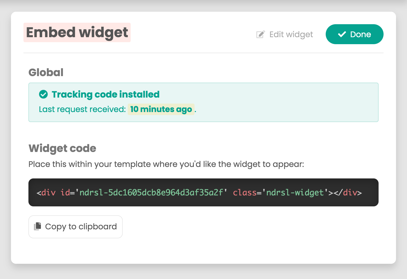 Embedding the widget is very simple. Click "Copy to clipboard" and paste the embed code into your website exactly where you want the widget to appear.