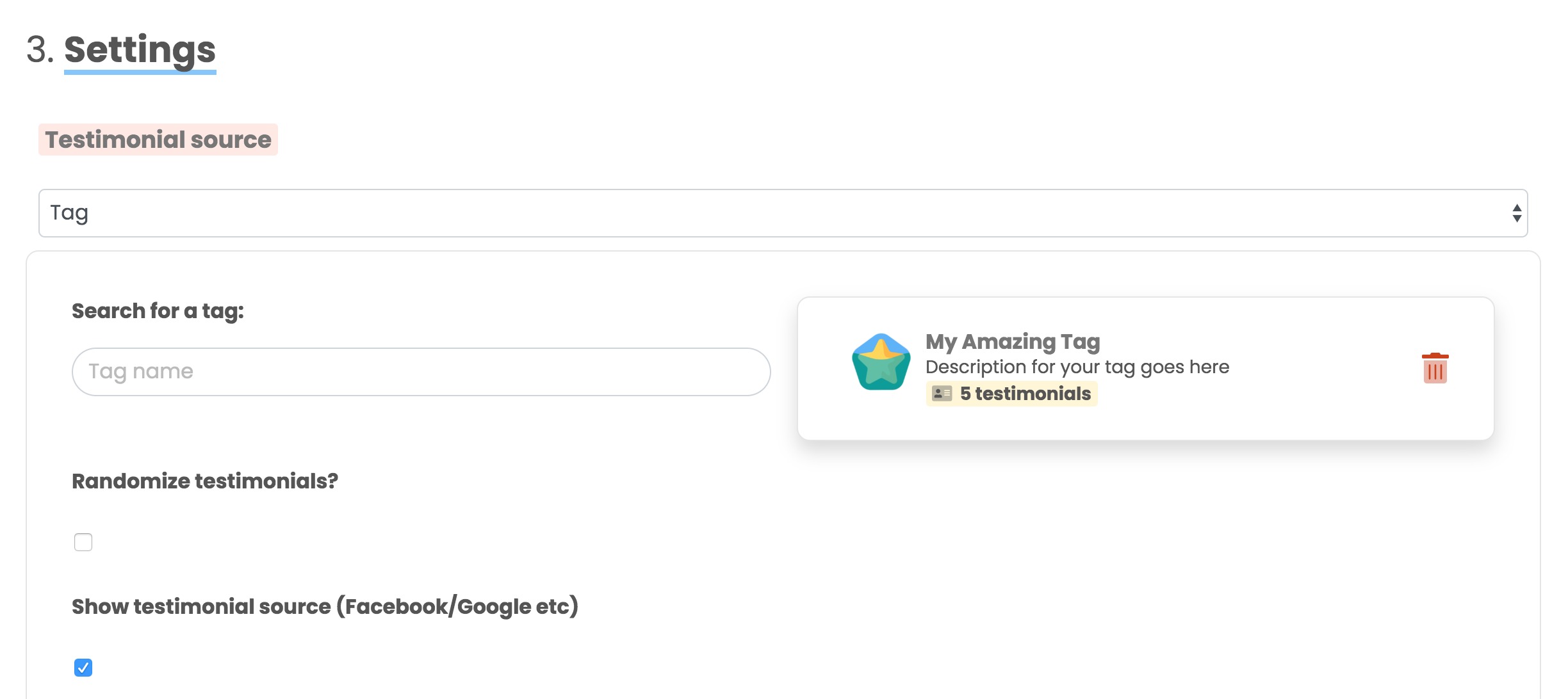 You'll see that "Testimonial source" is set to "Tag" and the tag in question is pre-selected, like this: