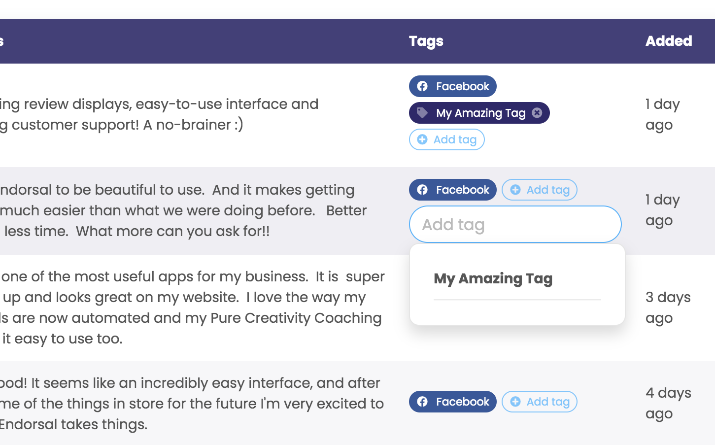 Head to the testimonials page and you'll see a "Tags" column. Click "Add tag" and you can select from a list of recent tags or search for the one you want. Click a tag and it'll be added to that testimonial.