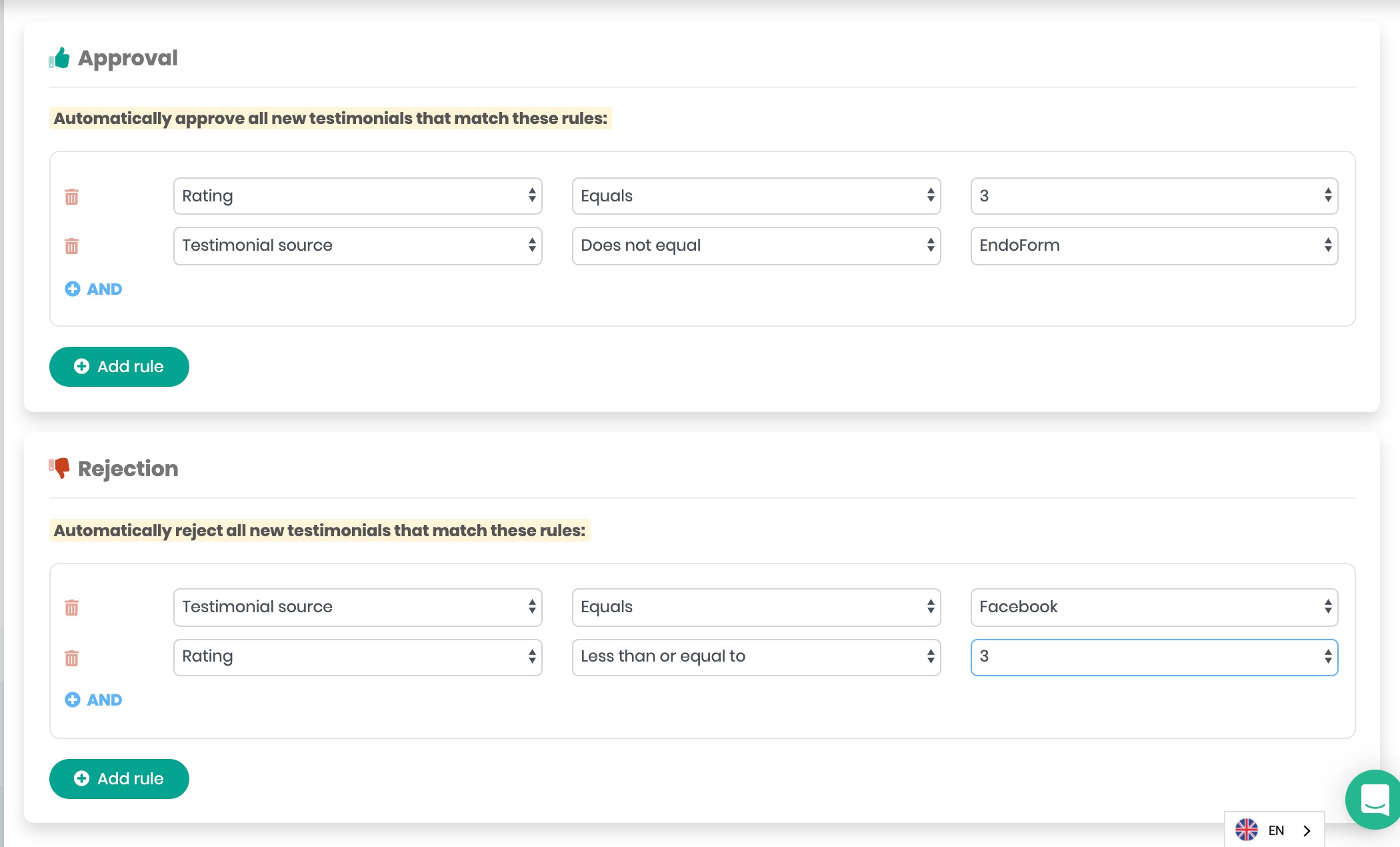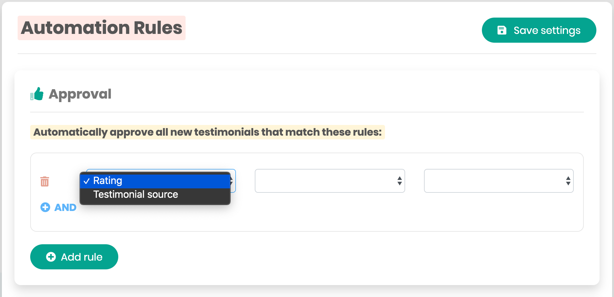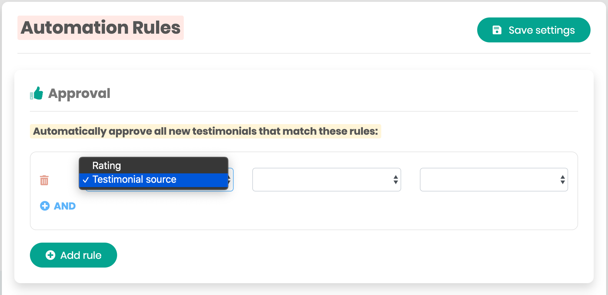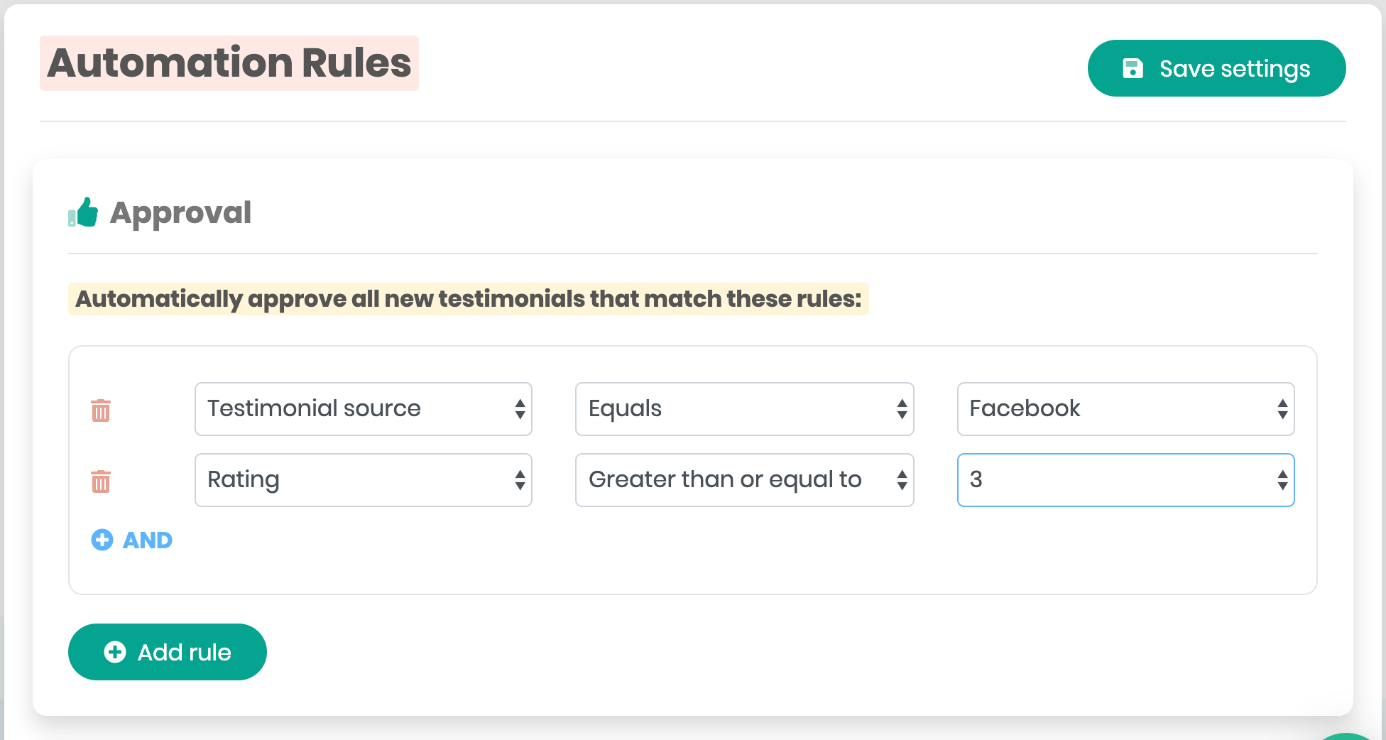 The Automation Rules page in enables you to choose which testimonials are automatically accepted and displayed, left inactive (waiting for your action), or rejected (shows as inactive in the testimonials list).
