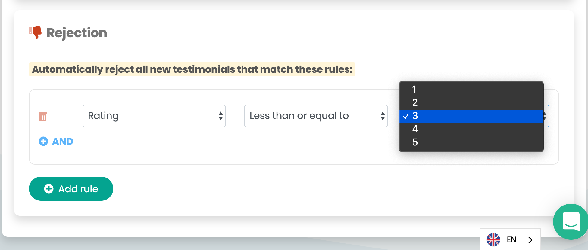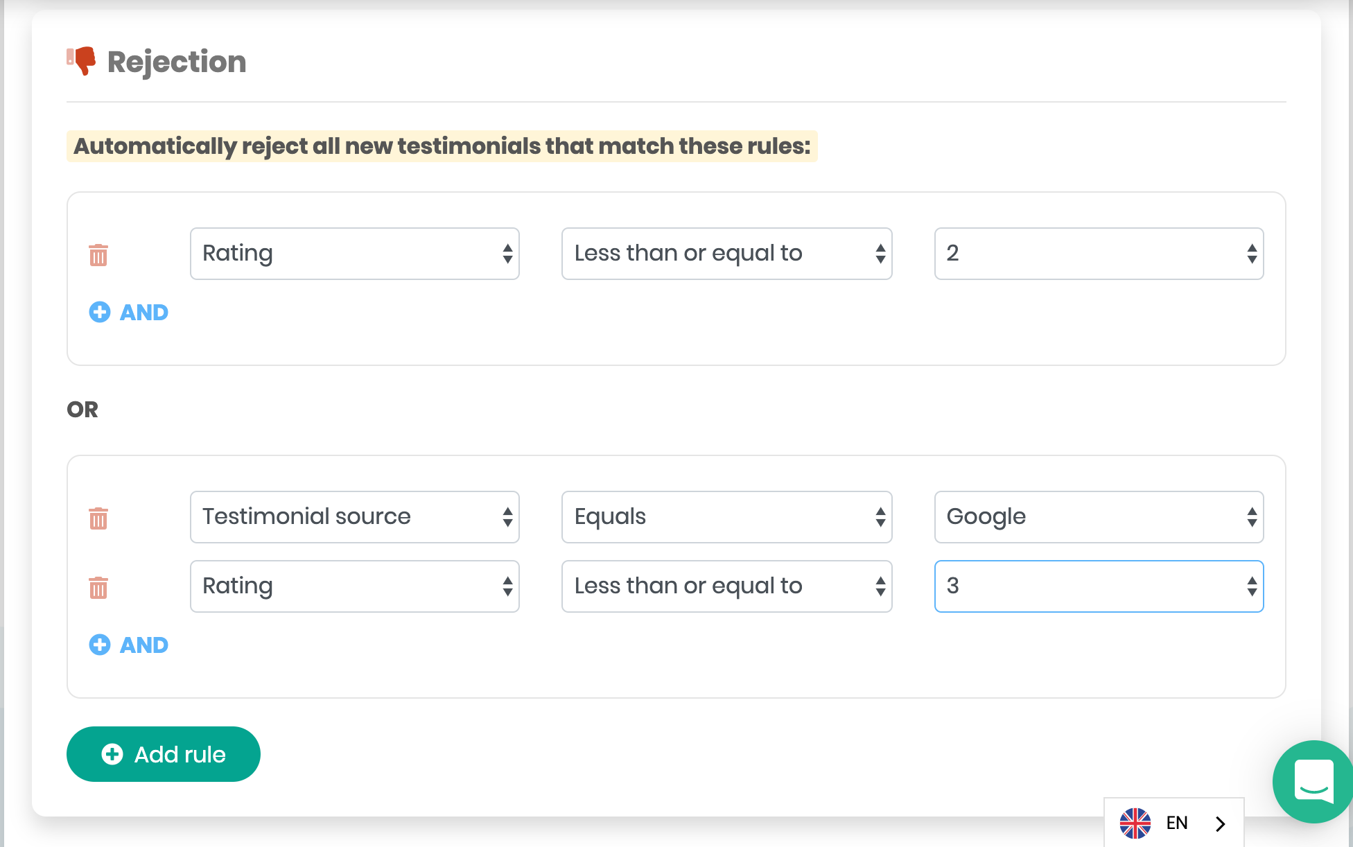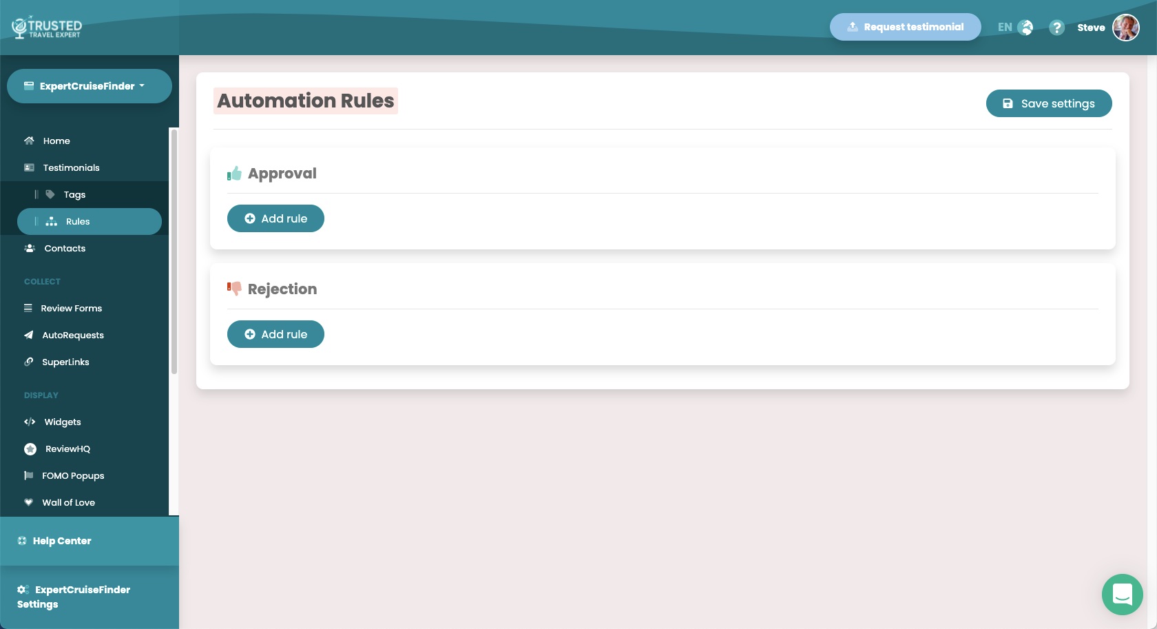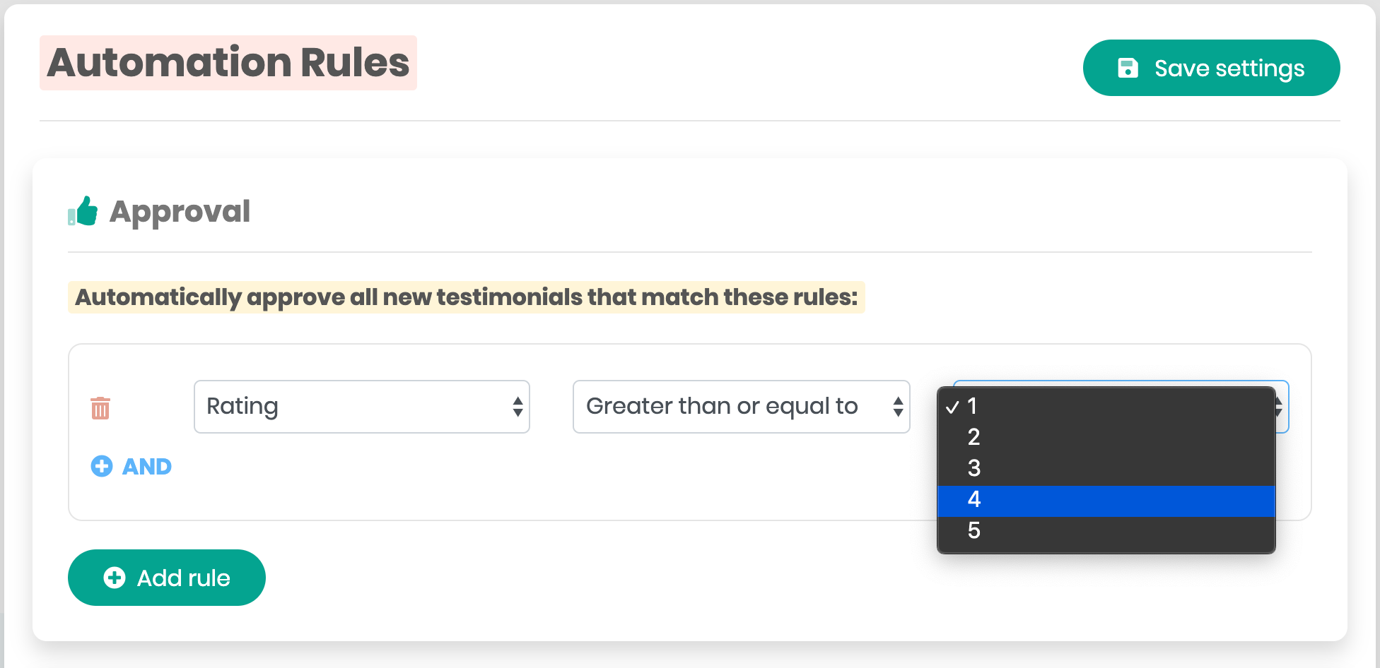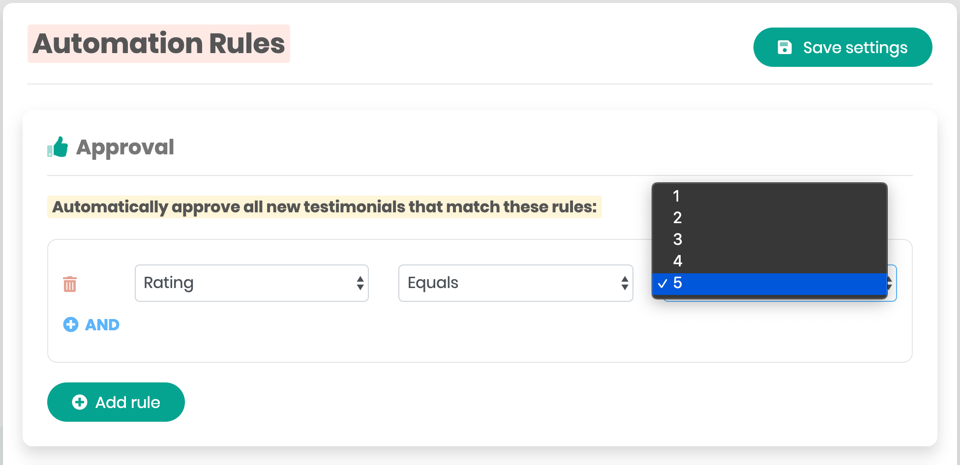 The Automation Rules page in enables you to choose which testimonials are automatically accepted and displayed, left inactive (waiting for your action), or rejected (shows as inactive in the testimonials list).