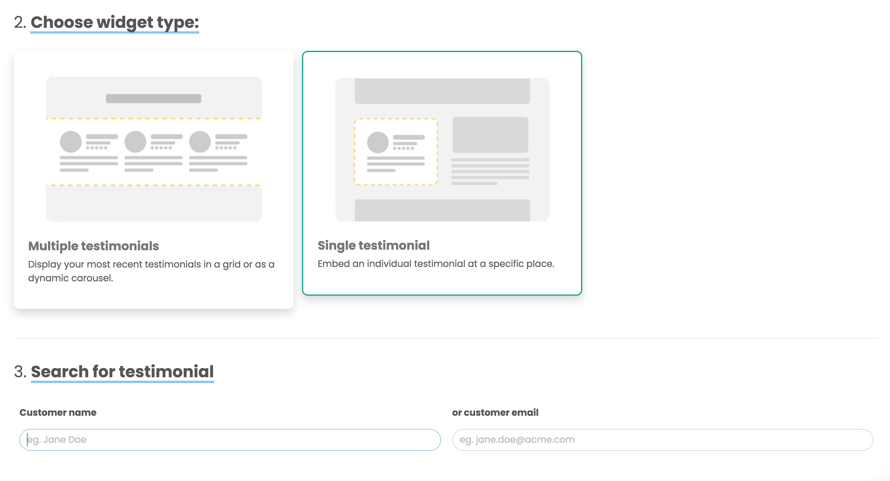 Here is where you select the testimonial you'd like to display. Search for the testimonial using the customer's name or email address.
