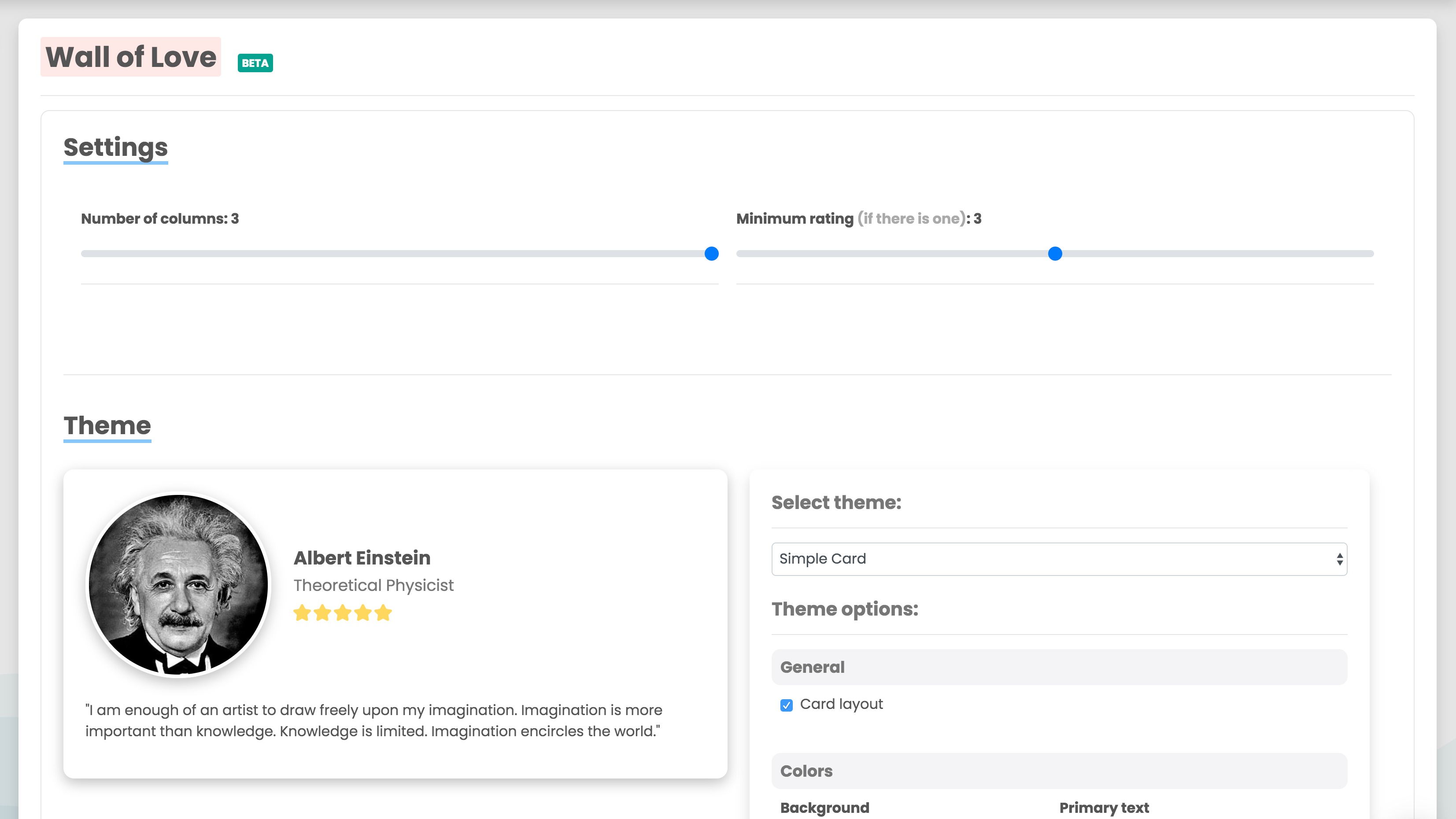 In the same way you can customise the theme for widgets, the Wall of Love allows you to style the testimonial appearance to suit your brand.