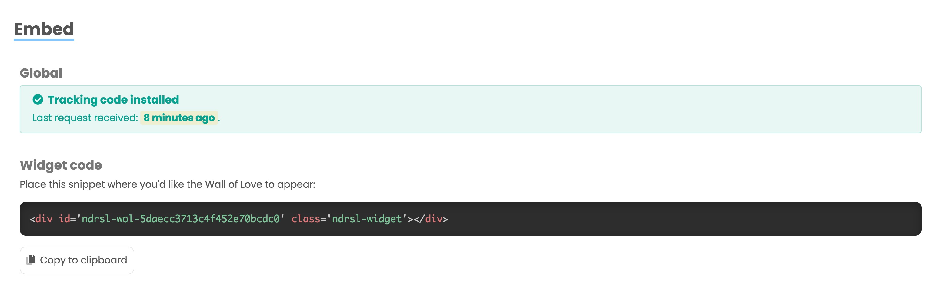 Then click "Copy to clipboard" and paste the code on your website where you'd like the Wall of Love to appear.
